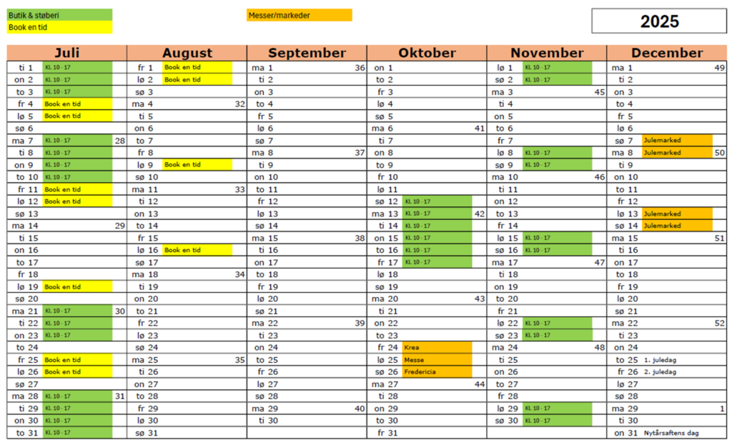 Åbningstider Efterår 2025 Hvornår har vi åbent? Se på kalenderen nedenfor. De grønne dage kan du se hvilke tidspunkter vi har åbent. De orange dage kan du se hvis vi er på messer eller andet De gule dage kan du lave en aftale med os når du vil lave lys Besøg os i åbningstiden eller brug de to link nedenfor. Når du skal booke en tid er der to muligheder: 1. Du kan købe en pakke aktivitet allerede inden i kommer. 2. Hvis du ikke kan komme når vi har åbent kan du lave en aftale og besøge os på andre tidspunkter. 1. Køb en pakke aktivitet, klik her 2. Book tid en af de andre dage, klik her Trænger i til en hyggelig og anderledes oplevelse så kan i besøge Corra Design hvor i kan lave jeres eget lys eller købe færdige lys til jer selv eller til gaver.
