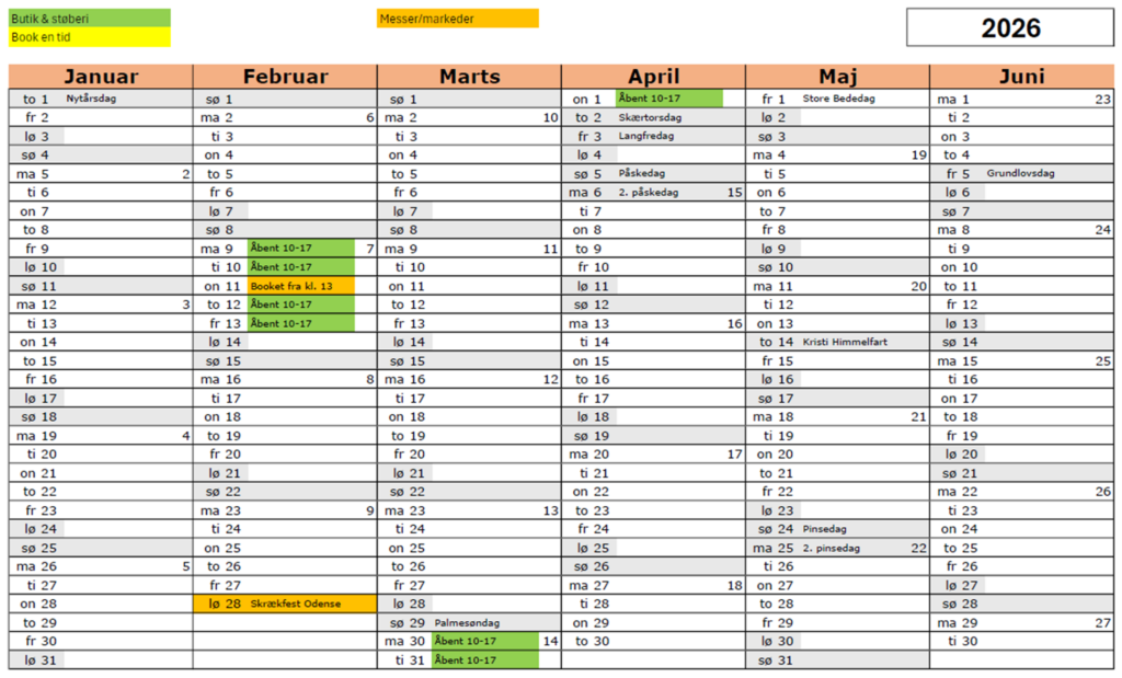 Åbningstider Vinter 2026 Hvornår har vi åbent? Se på kalenderen nedenfor. De grønne dage kan du se hvilke tidspunkter vi har åbent. De orange dage kan du se hvis vi er på messer eller andet De gule dage du kan kontakte os og lave en aftale når du vil lave lys Du kan booke en tid på forhånd, klik på link herunder 1. Køb workshop, klik her Trænger i til en hyggelig og anderledes oplevelse så kan i besøge Corra Design hvor i kan lave jeres eget lys eller købe færdige lys til jer selv eller til gaver.